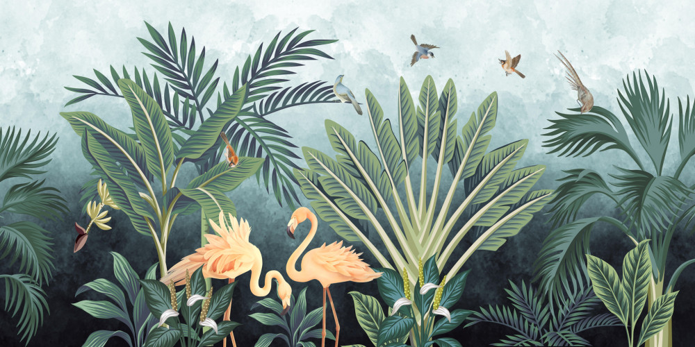 Tapet Fototapet flamingo roz pe apa din junglă (articol a94195 ) din categoria Fototapet 3D