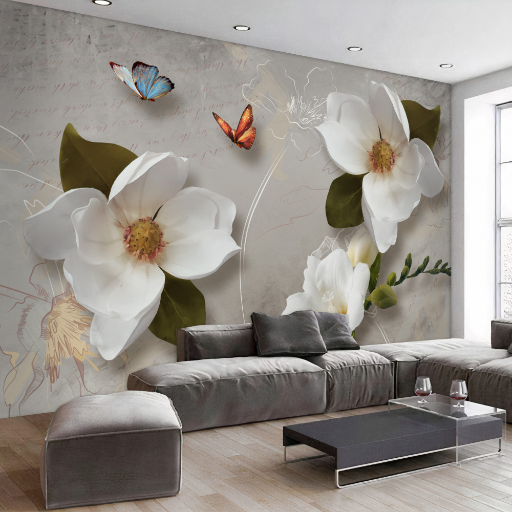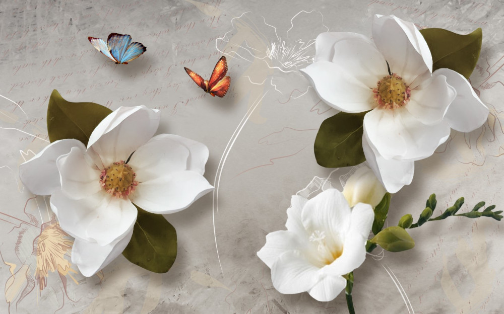 Tapet Fototapet flori de lotus delicate albe și fluturi (articol a91192 ) din categoria Fototapet Flori 3D