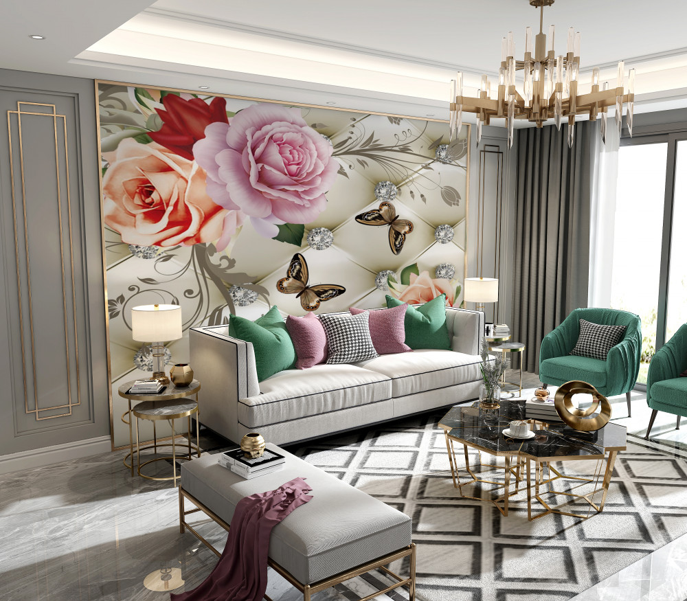 Tapet Fototapet fluturi pe muguri de trandafiri strălucitori cu perle (articol a93585 ) din categoria Fototapet Flori 3D