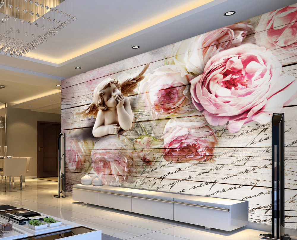 Tapet Fototapet înger gânditor și trandafiri roz (articol a90949 ) din categoria Fototapet Flori