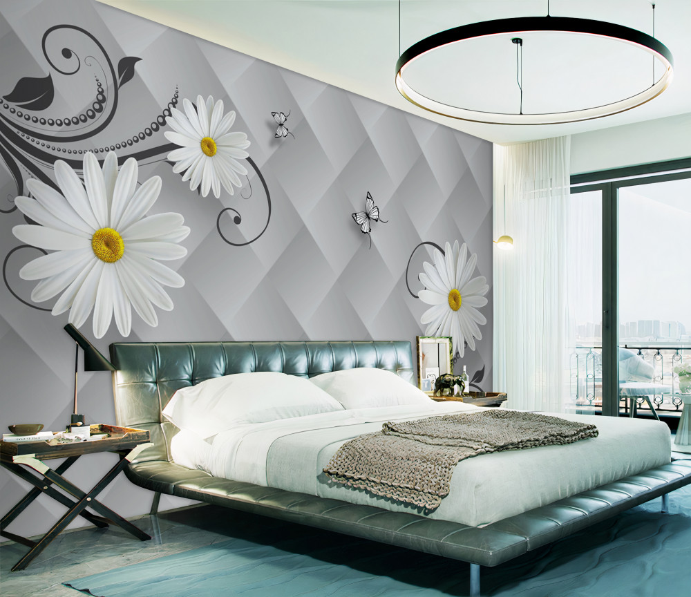 Tapet Fototapet margarete albe cu fluturi pe un fundal abstract (articol a94339 ) din categoria Fototapet 3D