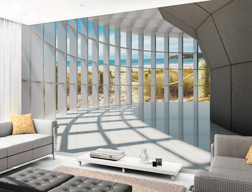 Tapet Fototapet vedere la mare prin ferestre albe din hol (articol a93666 ) din categoria Fototapet Natura