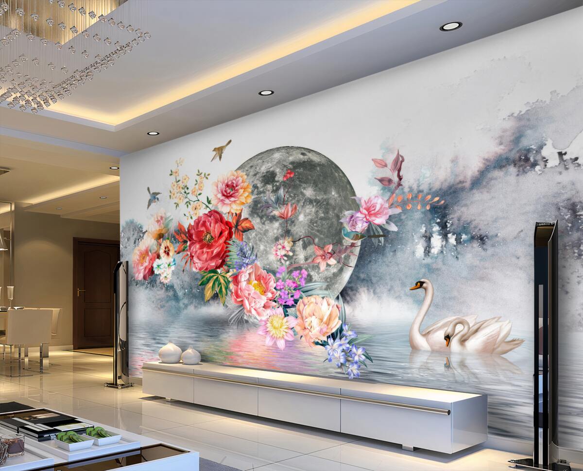 Fototapet Flori, lună plină și păsări