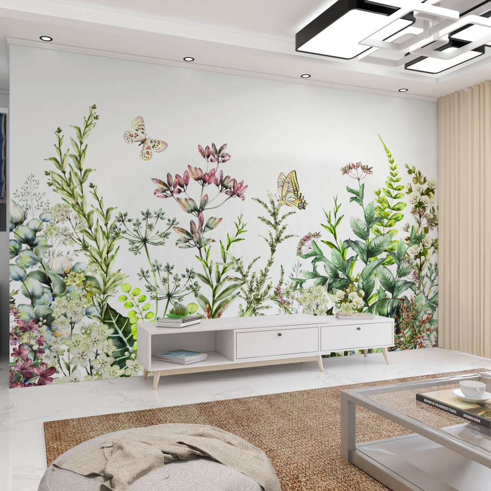 Fototapet flori galbene și violete pe un zid de cărămidă