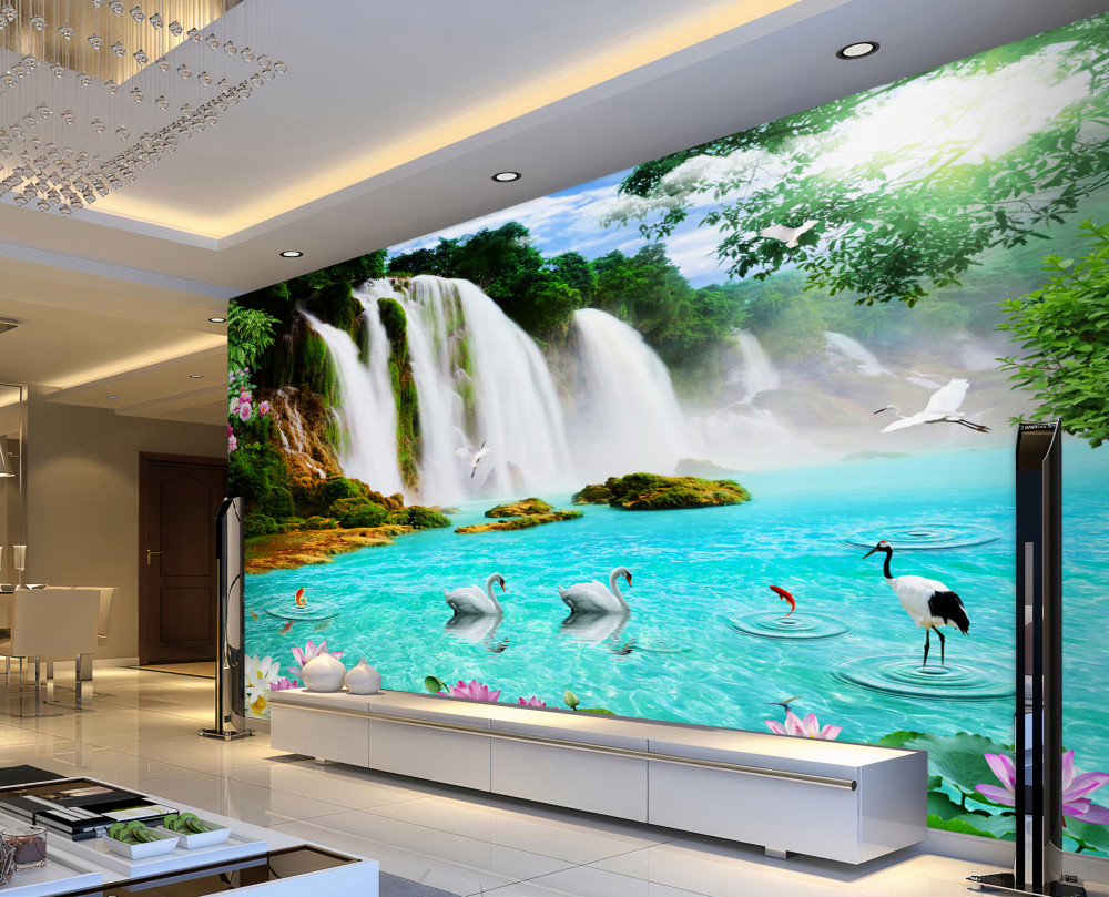 Tapet Fototapet apă albastră cristalină cu lebede la cascadă (articol a93119 ) din categoria Fototapet Natura