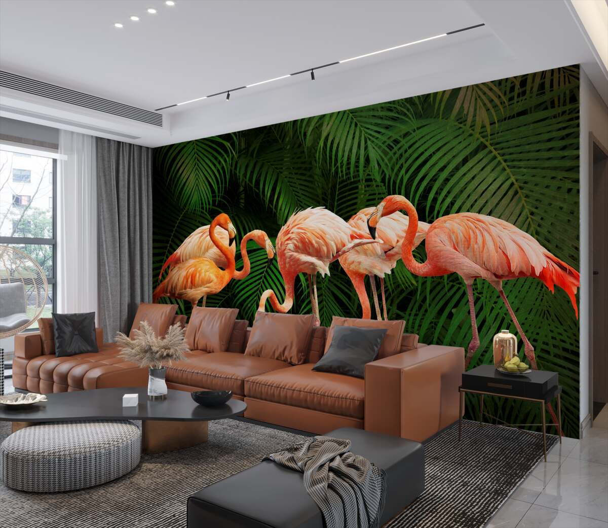 Tapet Fototapet Flamingo roz în pădurea verde (articol a98744 ) din categoria Fototapet Natura
