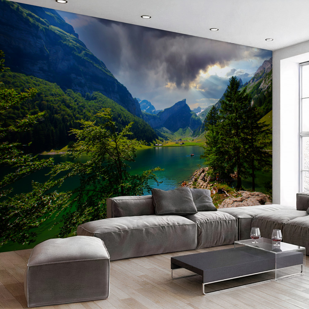 Fototapet munți lângă un lac verde într-o zi de vară