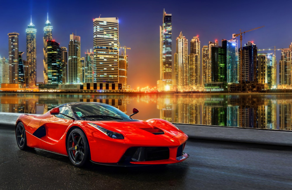 Tapet Fototapet mașină sport pe fundalul orașului de noapte (articol a91241 ) din categoria Fototapet Orașe și țări