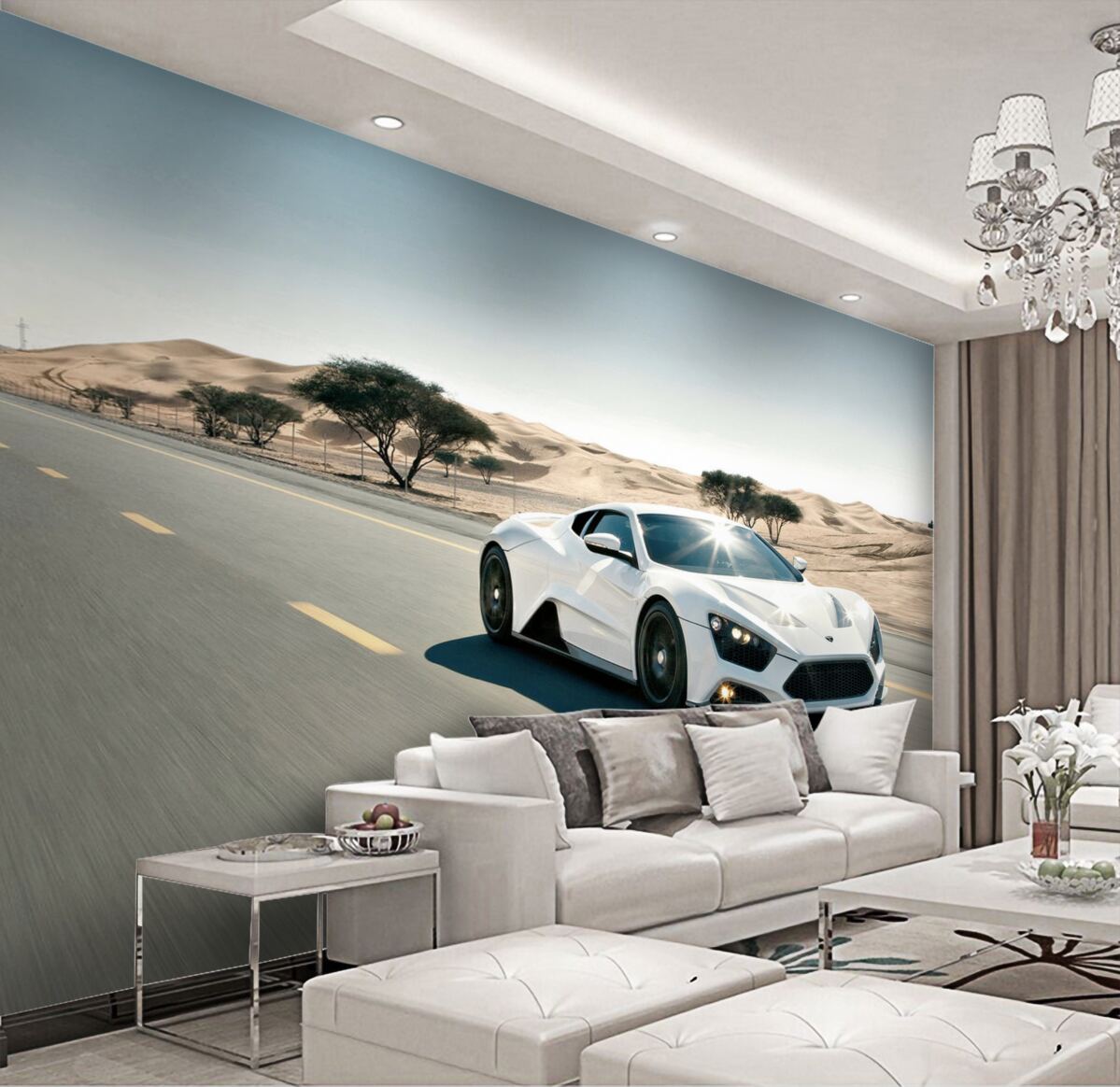 Tapet Fototapet mașină sport albă pe pistă în deșert (articol a95875 ) din categoria Fototapet Popular