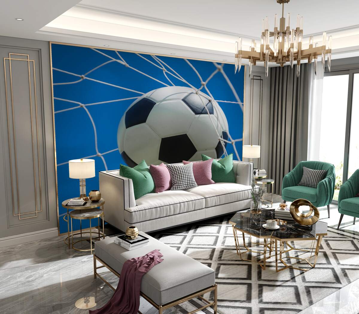 Fototapet Mingea de fotbal sparge peretele cu strălucire aurie